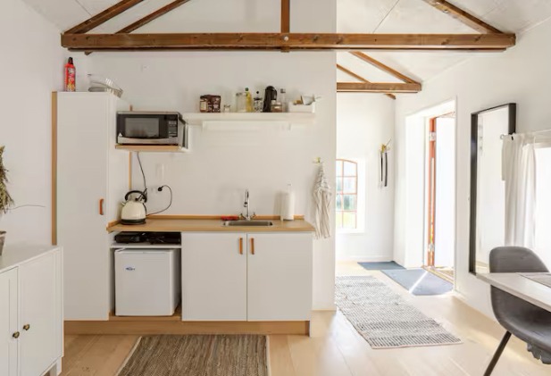 Huset er ca 30 kvm og indeholder en stue med udslags sofa til en 140 cm seng, et lille tekøkken med en induktionsplade, samt kombiovn og vandkeddel. Huset har toilet med bad.